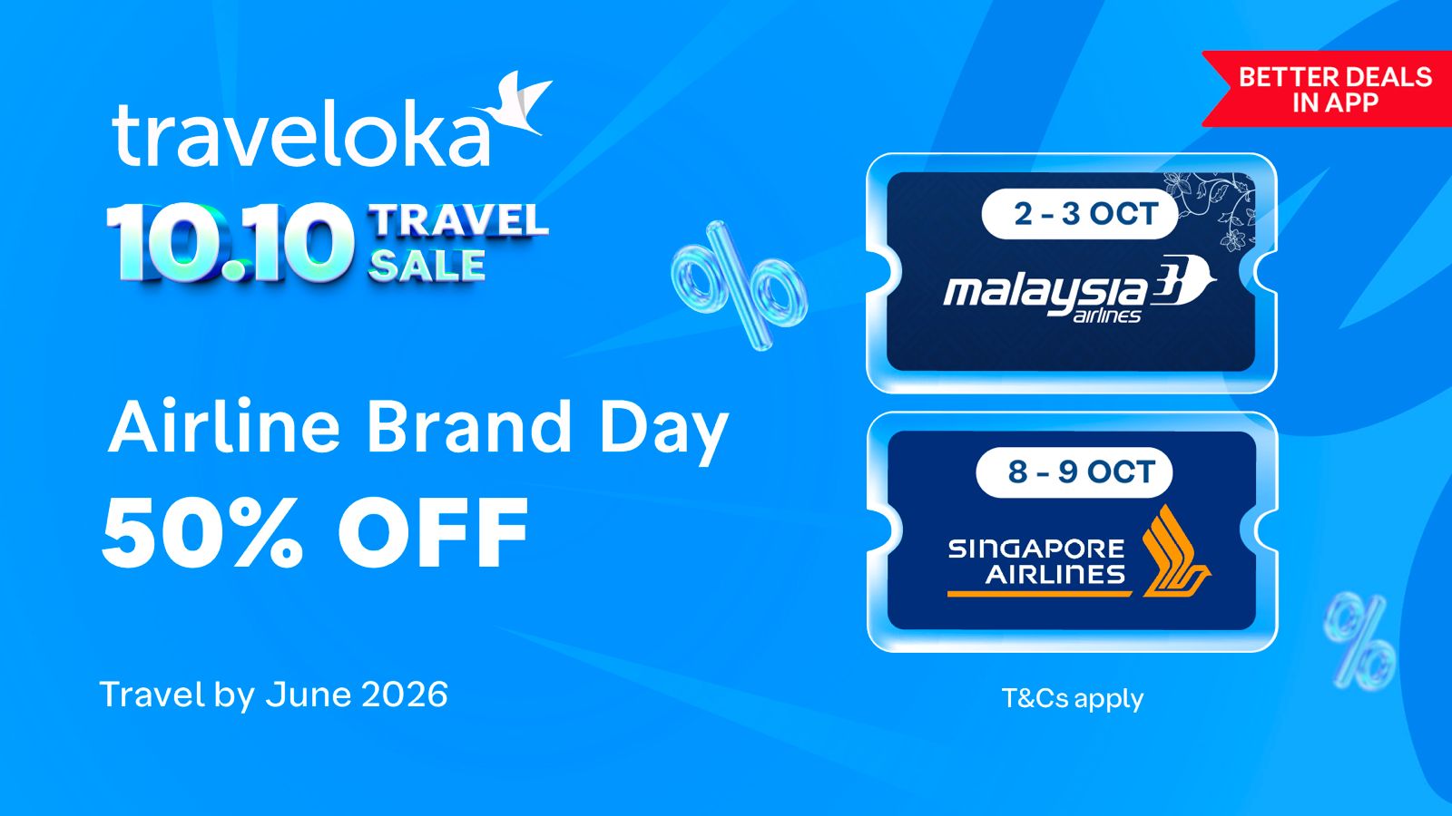 Promo menarik bisa dinikmati sepanjang Airlines Brand Days dengan diskon 50% dari maskapai partner Traveloka — Garuda Indonesia (1–2 Oktober), Malaysia Airlines (6–7 Oktober), dan Singapore Airlines (8–9 Oktober). Selain itu, tersedia juga flash sale harian hingga Rp10 juta, kupon diskon Rp500 ribu untuk pengguna baru, serta triple points untuk anggota Traveloka Priority.