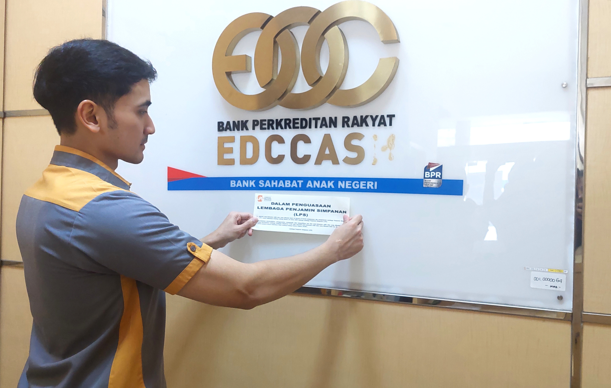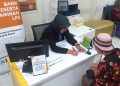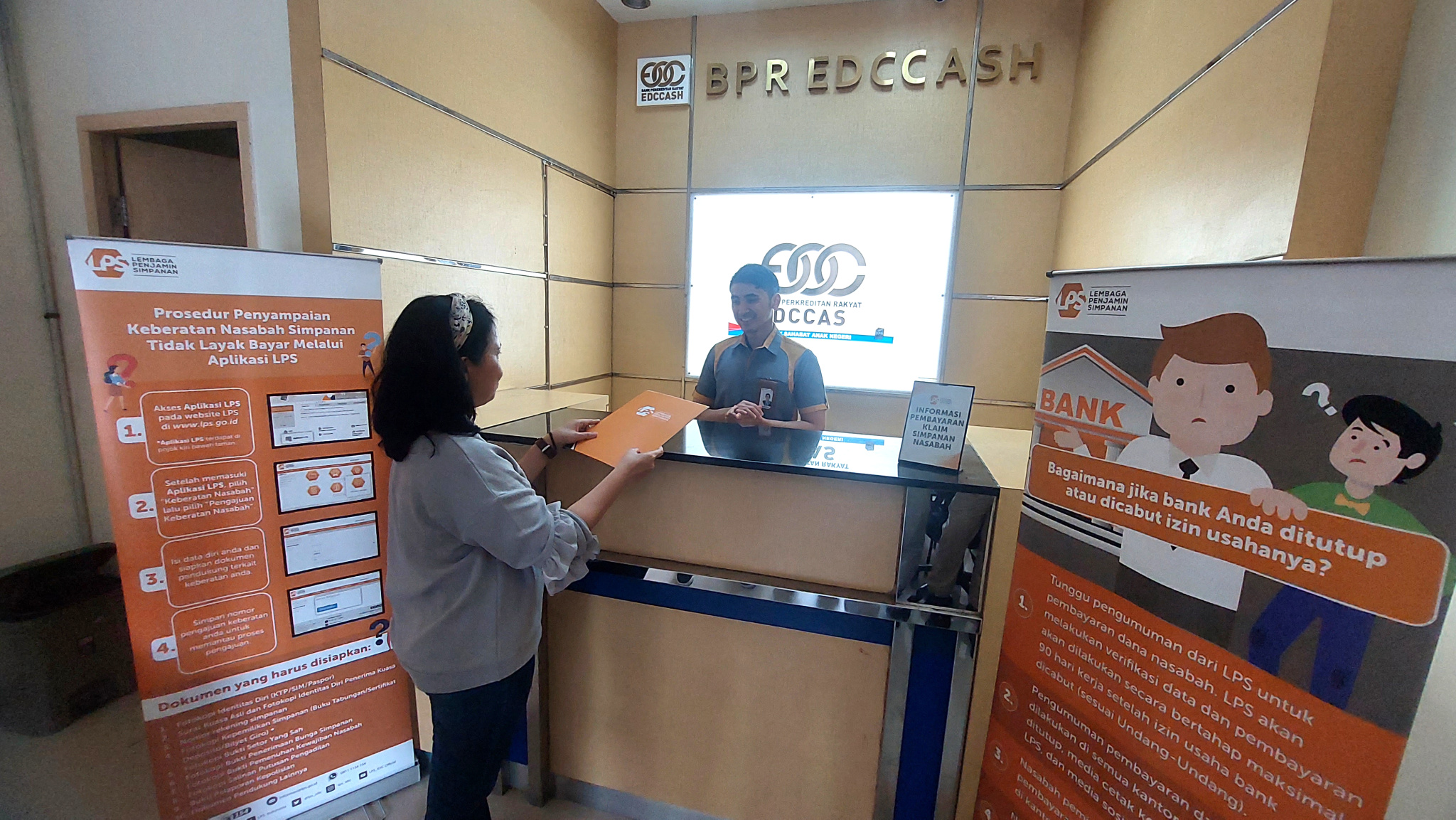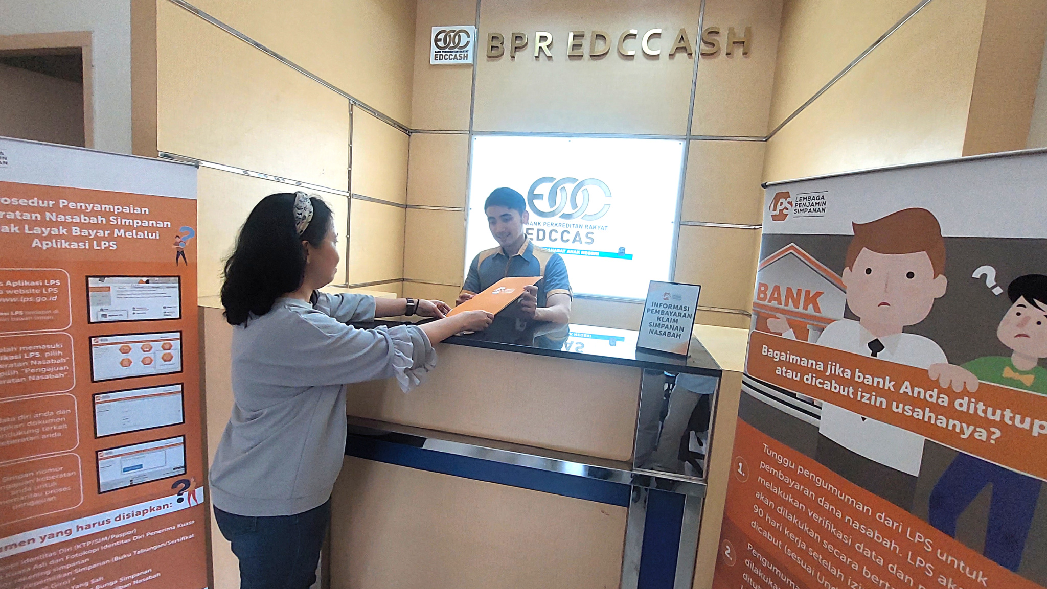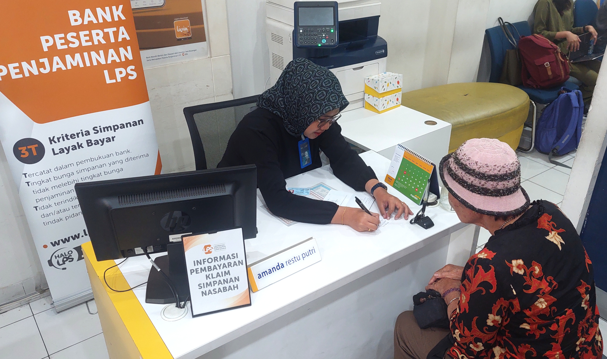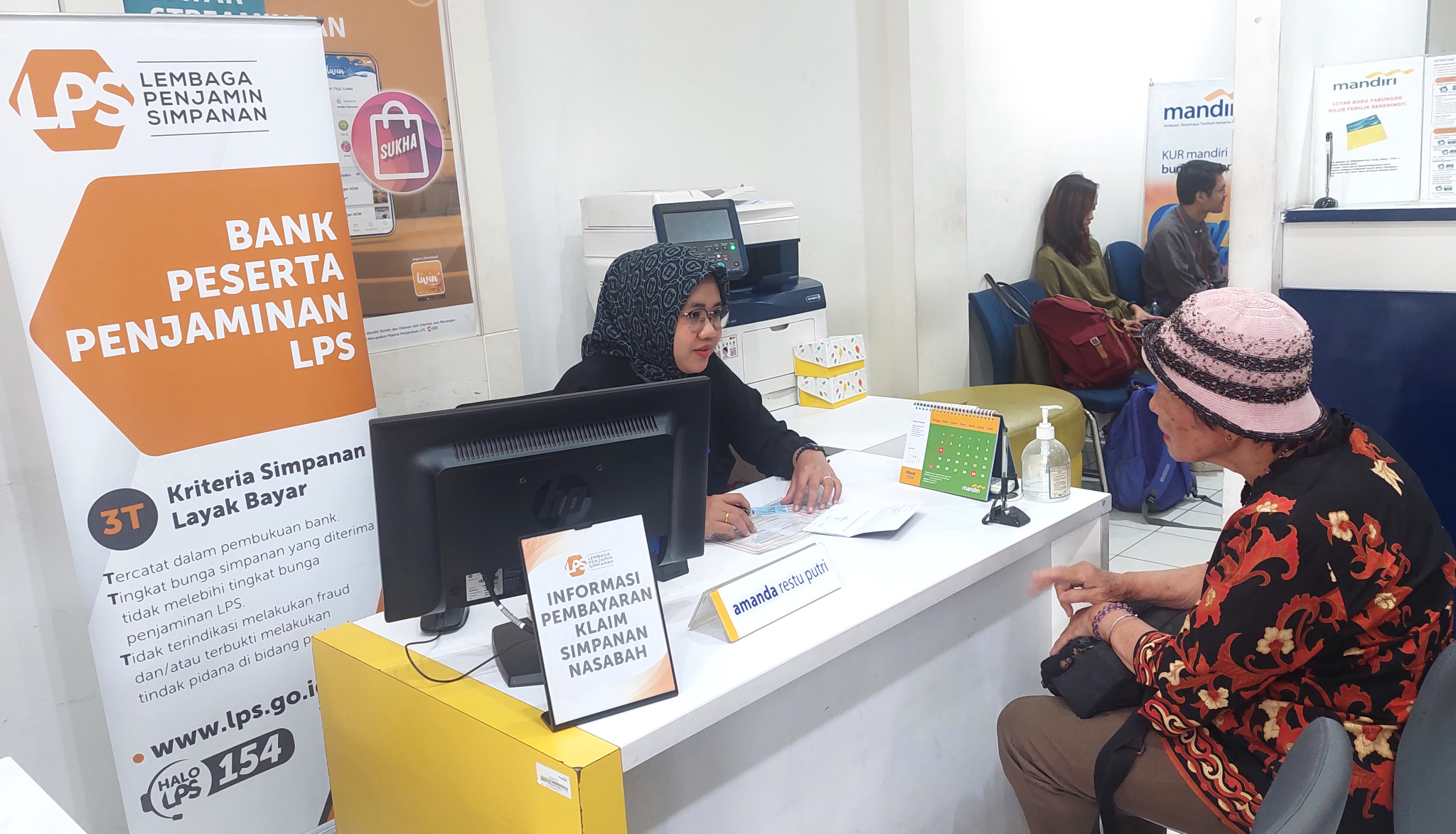Seorang karyawan Bank Pembayar yaitu Bank Mandiri dan petugas dari LPS membantu nasabah dari Bank Perkreditan Rakyat (BPR) EDC Cash untuk mengurus simpanan depositonya setelah mendapatkan jaminan dari Lembaga Penjamin Simpanan (LPS) di Kabupaten Tangerang, Banten, Jumat (01/03/2024). Lembaga Penjamin Simpanan (LPS) membayarkan klaim penjaminan simpanan nasabah Bank Perkreditan Rakyat (BPR) EDC Cash tahap I senilai Rp4,3 miliar, dengan jumlah rekening sebanyak 278 rekening