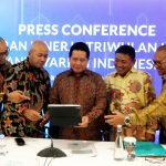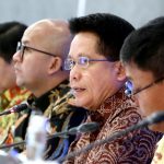 Direktur Utama BSI Hery Gunardi (tengah), didampingi Direktur Risk Management Grandis Helmi Harumansyah (kiri), Direktur Finance & Strategy Ade Cahyo Nugroho (dua dari kiri), Wakil Direktur Utama Bob T.Ananta (empat dari kiri), Direktur Teknologi Informasi Saladin D.Effendi (paling kanan). Berbincang Usai Paparan Kinerja BSI di Jakarta, Selasa (31/10). PT Bank Syariah Indonesia Tbk (BSI) berhasil menjaga kinerja yang solid hingga kuartal III/2023 dan berhasil mencetak laba yakni Rp4,20 Triliun tumbuh 31,04%.