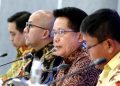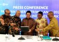 Direktur Utama BSI Hery Gunardi (tengah), didampingi Direktur Risk Management Grandis Helmi Harumansyah (kiri), Direktur Finance & Strategy Ade Cahyo Nugroho (dua dari kiri), Wakil Direktur Utama Bob T.Ananta (empat dari kiri), Direktur Teknologi Informasi Saladin D.Effendi (paling kanan). Berbincang Usai Paparan Kinerja BSI di Jakarta, Selasa (31/10). PT Bank Syariah Indonesia Tbk (BSI) berhasil menjaga kinerja yang solid hingga kuartal III/2023 dan berhasil mencetak laba yakni Rp4,20 Triliun tumbuh 31,04%.