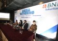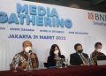 (kiri ke kanan): Marketing and Corporate Communication Division Dedi Arianto, Equity Reasearch BNI Sekuritas Aurelia Setiabudi, Chief Economiest BNI Sekuritas Damhuri Nasution, Direktur BNI Sekuritas Putu Bagus Kresna, Technical Analyst BNI Sekuritas Andri Zakaria dan Head of Fixed Income Reasearch BNI Sekuritas Amir Dalimunthe dalam acara media gathering Market Outlook Q2 2022 di Jakarta, Kamis 31 Maret 2022.