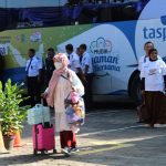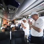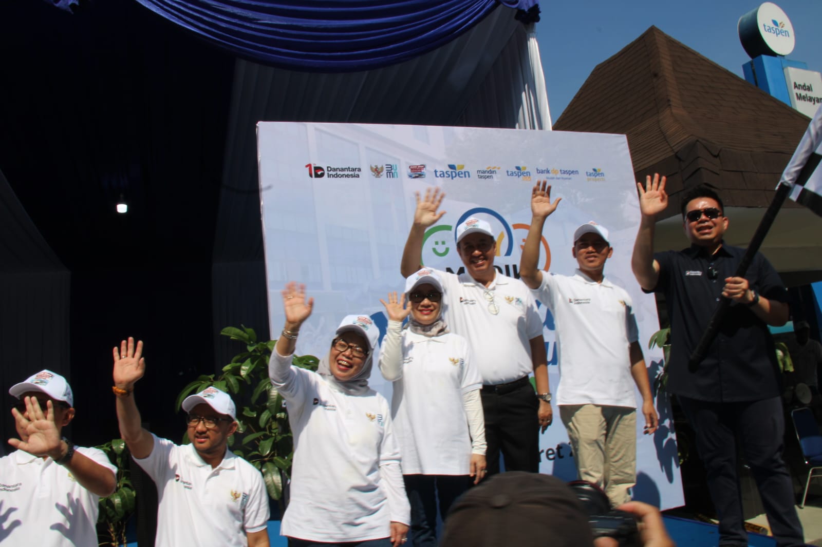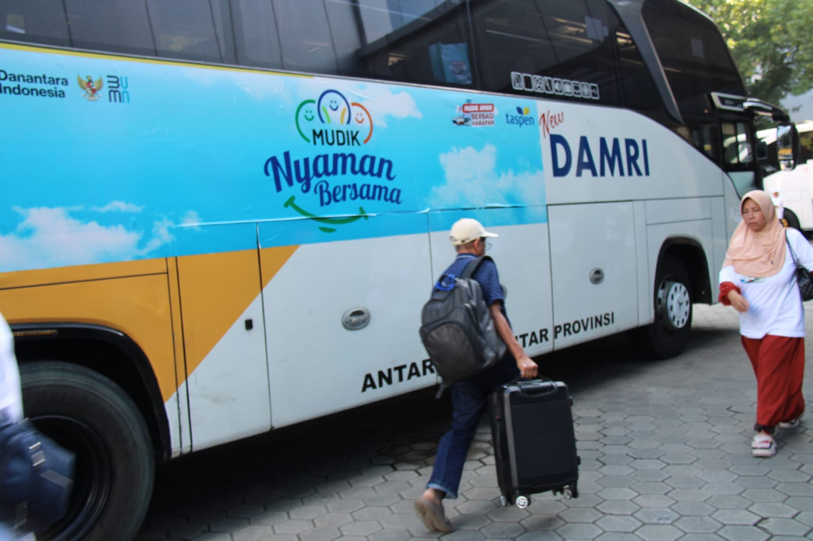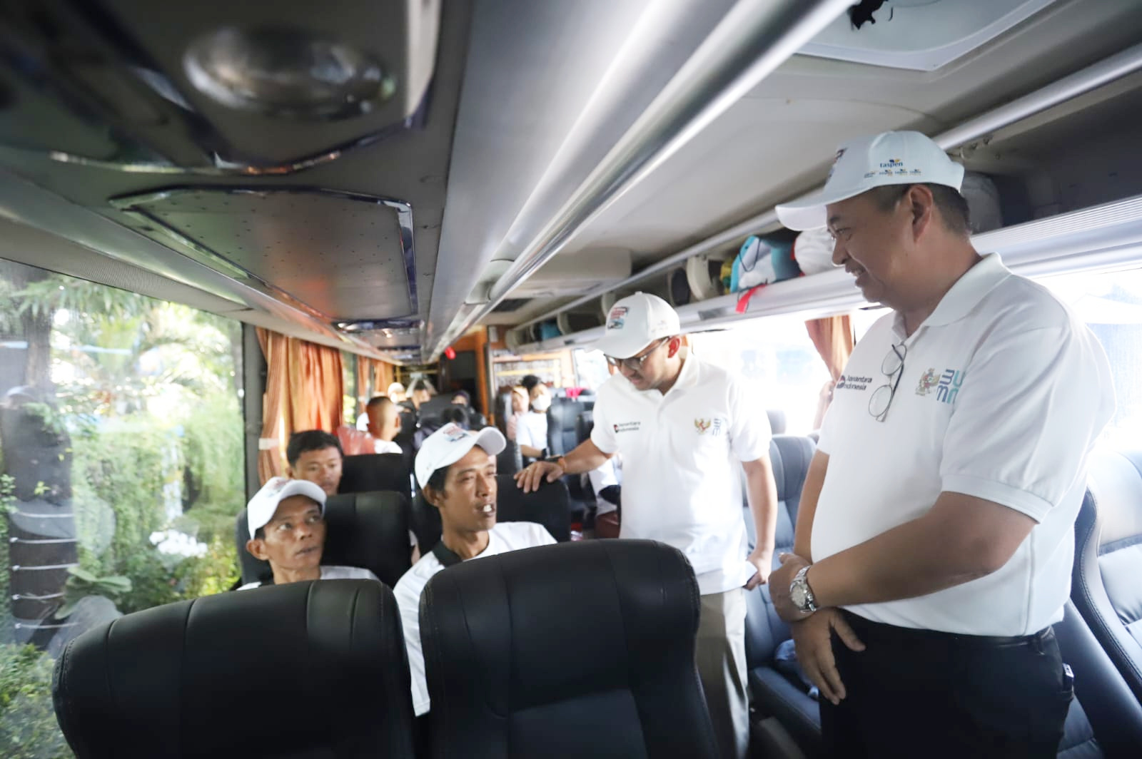 Direktur Utama Bank Mandiri Taspen Panji Irawan (kanan), dan Direktur Investasi PT Taspen Rifki Isnaini Hassan (kedua kanan) berbincang dengan pemudik saat melepas Mudik Nyaman Bersama TASPEN 2026 di Jakarta, Selasa (17/3/2026). Taspen memberangkatkan sebanyak 1.400 pemudik menggunakan 35 bus menuju berbagai daerah tujuan, program mudik gratis ini bertujuan memfasilitasi masyarakat untuk pulang ke kampung halaman dengan aman dan nyaman pada momentum Idulfitri.