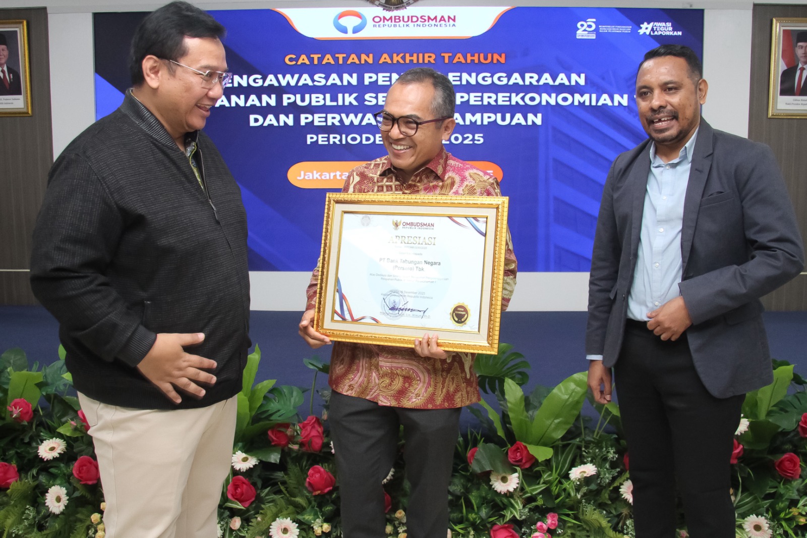 Direktur Human Capital & Compliance PT Bank Tabungan Negara (Persero) Tbk, Eko Waluyo (tengah) tersenyum usai menerima apresiasi dari Pimpinan Ombudsman RI, Yeka Hendra Fatika, dan Kepala Keasistenan Utama III Ombudsman RI, Yustus Y. Maturbongs di Kantor Ombudsman RI, di Jakarta, Kamis (18/12). BTN kembali mendapatkan apresiasi sebagai Mitra Strategis Pelayanan Publik Sektor Perekonomian I dari Ombudsman Republik Indonesia. Penghargaan ini sejalan dengan komitmen BTN dalam memberikan pelayanan terbaik bagi masyarakat Indonesia serta menjaga kepercayaan publik melalui penerapan tata kelola yang baik, kepatuhan terhadap regulasi, dan peningkatan kualitas layanan secara berkelanjutan. Bagi BTN, apresiasi ini menjadi pengakuan sekaligus motivasi untuk terus memperkuat peran sebagai mitra strategis pemerintah dalam mendorong pelayanan publik yang transparan, akuntabel, dan berorientasi pada kebutuhan masyarakat, khususnya dalam mendukung sektor perumahan dan perekonomian nasional.