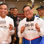 Gubernur DKI Jakarta Pramono Anung (kiri) dan Direktur Utama PT Bank Tabungan Negara (Persero) Tbk, Nixon LP Napitupulu (kanan) menunjukkan BIB masing-masing usai pengambilan race pack di Race Expo BTN JAKIM 2025 di Kartika Expo, Jakarta, Kamis (26/6). Gelaran Race Expo selama tiga hari (26–28 Juni 2025) menjadi magnet antusiasme peserta jelang ajang BTN Jakarta International Marathon 2025 yang akan digelar pada Minggu, 29 Juni 2025 dan diikuti lebih dari 31.000 pelari. BTN JAKIM 2025 yang akan mengambil start di monas dan finish di GBK merupakan rangkaian acara HUT DKI Jakarta ke 498 yang mendukung Jakarta menjadi kota global dan sport tourism.