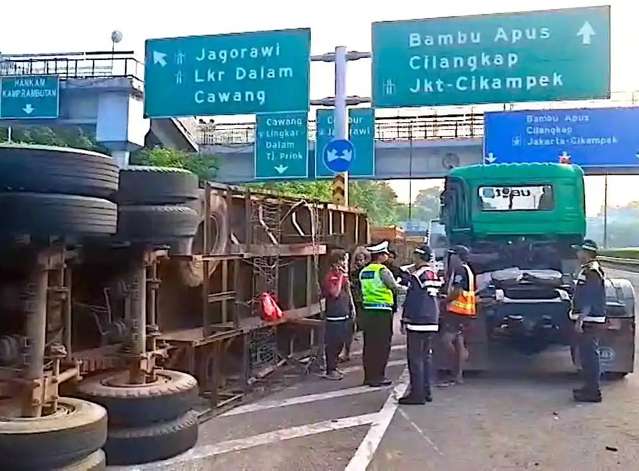 Metapos.id, Jakarta – Sebuah truk kontainer mengalami kecelakaan dan terguling di ruas Tol Lingkar Luar Jakarta (JORR) Kilometer 32, Kelurahan Bambu Apus, Kecamatan Cipayung, Jakarta Timur, Kamis (25/12/2025) pagi.
