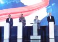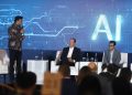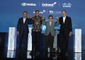 Wakil Menteri Komunikasi dan Digital (Komdigi) Nezar Patria (kedua kanan) bersama President Director & Chief Executive Officer (CEO) Indosat Vikram Sinha (kedua kiri), CEO Cisco Systems Chuck Robbins (kanan) dan Senior Vice President Telecom NVIDIA Ronnie Vasishta meluncurkan Indonesia’s Artificial Intelligence (AI) Center of Excellence di Jakarta, Jumat (11/7/2025). Komdigi secara resmi meluncurkan Indonesia’s AI Center of Excellence, ekosistem inklusif nasional untuk mendorong daya saing Indonesia di bidang AI melalui kolaborasi strategis dengan Indosat Ooredoo Hutchison (Indosat atau IOH), Cisco, dan NVIDIA.