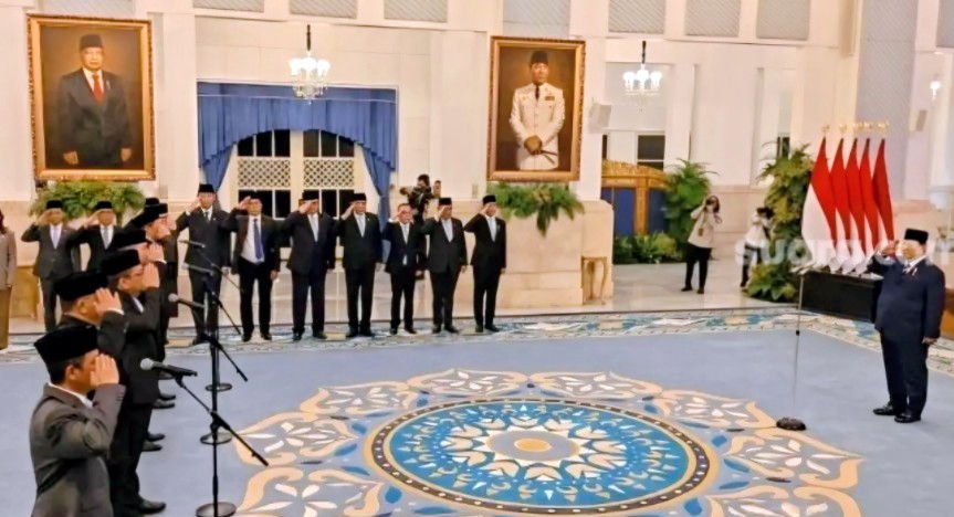 Prabowo memimpin langsung prosesi pengucapan sumpah jabatan di hadapan para menteri dan pejabat negara. Setelah itu, enam pejabat yang dilantik menyatakan komitmen setia kepada UUD 1945. Mereka juga berjanji menjalankan amanah dengan penuh tanggung jawab.
