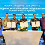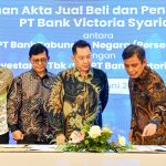 (BVIC) Achmad Friscantono, Wakil Direktur Utama BVIC Rusli, dan Direktur Utama PT Victoria Investama Tbk (VICO) Aldo Jusuf Tjahaja menunjukkan Akta Jual Beli usai Penandatanganan Akta Jual Beli dan Pengambilalihan Saham PT Bank Victoria Syariah (BVIS) disaksikan Komisaris Utama VICO Untung Woenardi serta Komisaris Utama BTN Suryo Utomo di Jakarta Kamis, 5 Juni 2025. Dengan Penandatanganan Akta Jual Beli dan Pengambilalihan Saham tersebut, BTN telah resmi mengakuisisi BVIS. BTN berharap aksi korporasi ini dapat mendukung pencapaian visi BTN untuk menjadikan BTN Syariah sebagai bank syariah nomor dua terbesar di Indonesia.