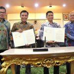 Direktur Utama BTN Nixon LP Napitupulu (kedua kiri) dan Rektor Institut Teknologi Sepuluh Nopember (ITS) Bambang Pramujati (kedua kanan) didampingi Direktur Finance BTN Nofry Rony Poetra (kiri) serta Wakil Rektor 2 ITS Mas Agus Mardy anto (kanan) memperlihatkan naskah kerjasama usai menandatangani perjanjian nota kesepahaman antara BTN dan ITS terkait kerjasama produk dan jasa Layana perbankan di Kampus ITS Surabaya Jawa Timur, Kamis (30/5). Kerjasama BTN dan ITS meliputi Pemanfaatan Produk dan Layanan Jasa Perbankan, Penyediaan Kesempatan Magang di Unit Kerja BTN, Pembayaran uang kuliah serta layanan transaksi keuangan melalui Cash Management System (CMS) dan Kerja sama Program Learning, Advisory and Research HFC BTN.