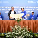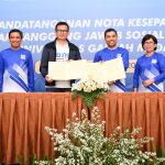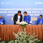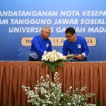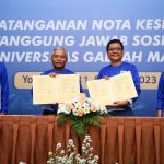 Direktur Finance Bank BTN Nofry Rony Poetra bersama Wakil Dekan Bidang Penelitian, Pengabdian Masyarakat dan Kerjasama UGM Ali Awaludin memperlihatkan naskah kerjasama disaksikan Direktur Utama Bank BTN Nixon LP Napitupulu, Direktur Distribution & Funding Bank BTN Jasmin, Rektor Universitas Gadjah Mada, Ova Emilia dan Wakil Rektor Bidang Sumber Daya Manusia dan Keuangan UGM Supriyadi usai penandatanganan kerjasama antara Bank BTN dan UGM di Yogyakarta, Jumat, 11 Agustus 2023. Saat ini, Bank BTN telah bekerjasama dengan UGM dalam hal pembiayaan Pendidikan seluruh mahasiswa S1 melalui semua Channel Bank BTN. Dalam bidang pendidikan, Bank BTN berharap kerjasama ini dapat melahirkan developer-developer muda untuk ikut berpartisipasi membangun perumahan di Indonesia.