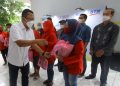 Direktur Utama PT Bank Tabungan Negara (Persero) Tbk, Haru Koesmahargyo didampingi Direktur Assets Management Elisabeth Novie Riswanti yang juga pembina Srikandi BTN menyerahkan bantuan sosial kepada masyarakat sebagai bentuk aksi amal dari kegiatan “Gerak” Srikandi BTN menyambut Hari Kartini di Jakarta, Jumat (22/4). Gerakan Kreasi dan Amal (Gerak) Srikandi BTN bertujuan untuk meningkatkan Pemberdayaan Perempuan dan Kepemimpinan Perempuan dengan kegiatan yang bermanfaat bagi perempuan maupun masyarakat.