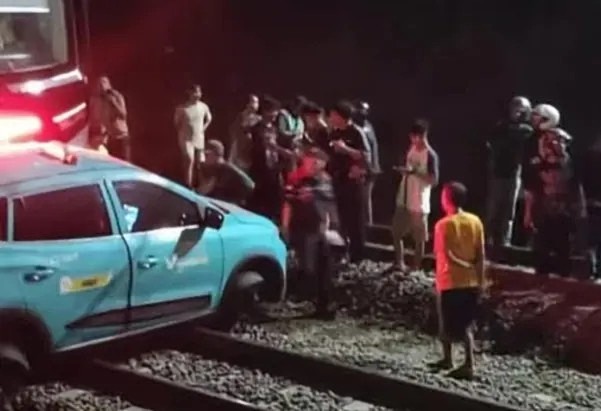 Beberapa saat kemudian, kereta yang melintas menghantam kendaraan itu. Meski demikian, benturan pertama hanya menimbulkan kerusakan pada mobil.