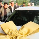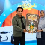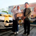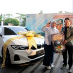 Direktur Utama BSI Hery Gunardi (kanan) menyerahkan hadiah utama 1 (satu) unit mobil BMW 321i kepada nasabah BSI KCP Cianjur Cipanas 2 Siti Rahmawati (kanan) pada acara Seremoni Penyerahan Hadiah Hujan Rezeki BSI Mobile di The Tower Jakarta, Jumat (19/7).