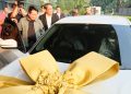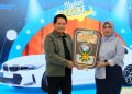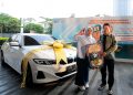Direktur Utama BSI Hery Gunardi (kanan) menyerahkan hadiah utama 1 (satu) unit mobil BMW 321i kepada nasabah BSI KCP Cianjur Cipanas 2 Siti Rahmawati (kanan) pada acara Seremoni Penyerahan Hadiah Hujan Rezeki BSI Mobile di The Tower Jakarta, Jumat (19/7).