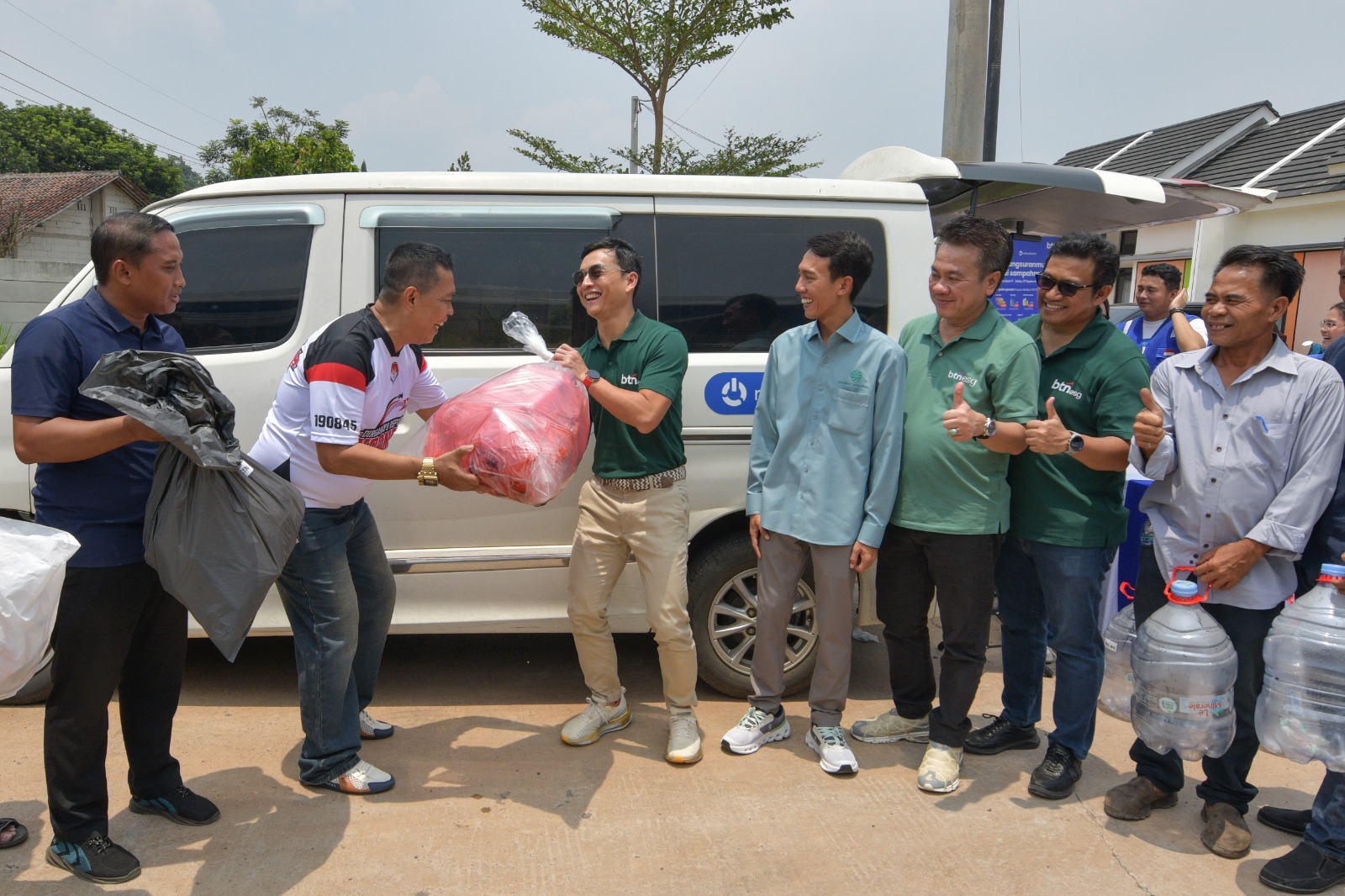 Direktur Risk Management PT Bank Tabungan Negara (Persero) Tbk. Setiyo Wibowo (kiri) didampingi Direktur Utama Pesona Kahuripan Angga Budi Kusuma (kedua kanan) menerima sampah dari warga Pesona Kahuripan 11, Bogor, Sabtu (27/9). BTN menghadirkan program inovatif yang memungkinkan nasabah mengurangi cicilan Kredit Pemilikan Rumah (KPR) melalui penukaran sampah rumah tangga menjadi tabungan. Program tersebut menjadi implementasi nyata BTN untuk mendukung Asta Cita Presiden Prabowo Subianto dalam mengembangkan ekonomi hijau di sektor perumahan, termasuk pengelolaan sampah dan pembangunan berbasis komunitas.