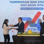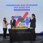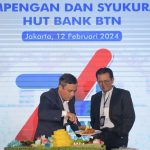 Direktur Utama BTN Nixon LP Napitupulu disaksikan Komisaris Utama BTN Chandra M Hamzah memberikan potongan nasi tumpeng kepada karyawan termuda BTN dalam acara Tumpengan dan Syukuran Perayaan HUT BTN ke-74 di Jakarta, Senin (12/2). Dalam usianya yang ke-74 tahun, BTN telah berhasil mengemban amanah melakukan pembiayaan perumahan khususnya bagi masyarakat berpenghasilan rendah (MBR). Dari total 5,2 juta unit rumah yang telah dibiayai BTN selama 74 tahun, sekitar 4,05 juta dinikmati oleh MBR melalui fasilitas KPR Subsidi.