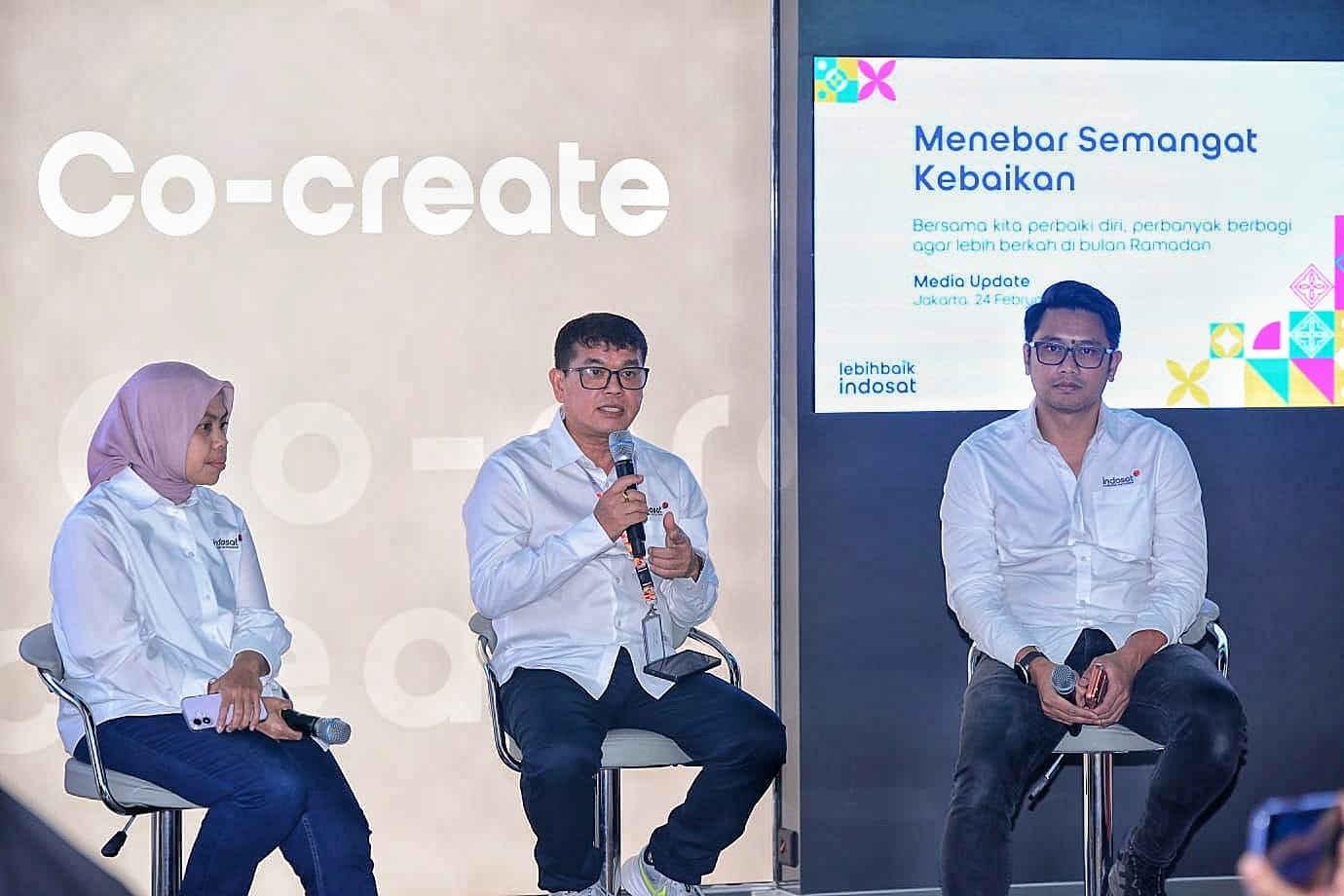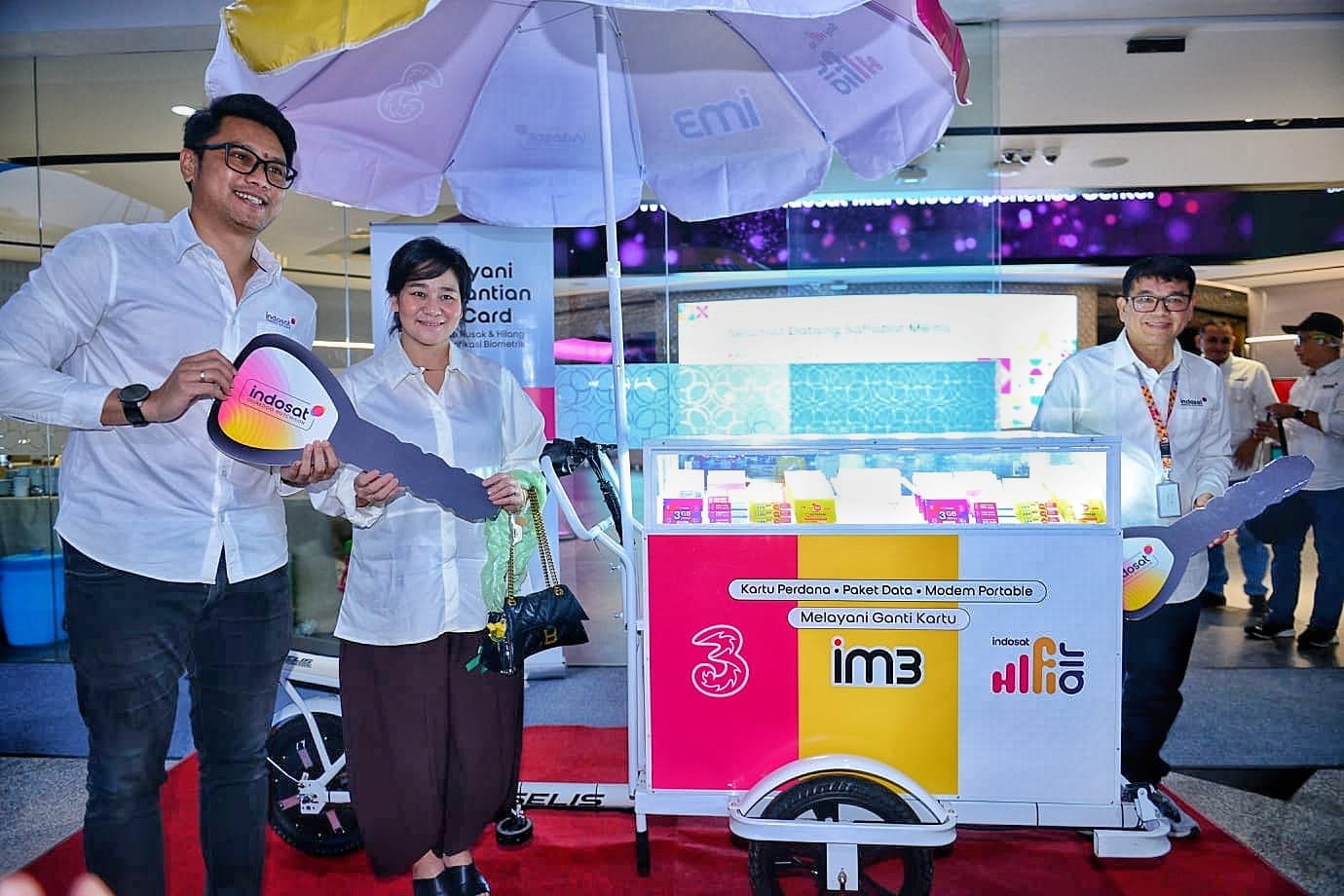 Swandi Tjia EVP-Head of Circle Jakarta Raya Indosat (paling kanan) dan Shatya Framudia SVP-Head of Region Inner Jakarta Indosat saat penyerahan Sepeda Listrik Outlet Keliling (Oling) kepada Mitra Outlet di Acara Media Update Lebih Baik Indosat yang berlangsung di Jakarta, Selasa (24/02). Program ini adalah bentuk nyata komitmen Indosat dalam memberdayakan mitra lokal dan memperluas akses layanan digital bagi masyarakat. Indosat terus menghadirkan inovasi distribusi yang adaptif. modern dan berkelanjutan.